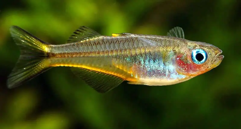Es una especie pequeña y elegante que alcanza aproximadamente 4 a 5 cm de longitud. Se caracteriza por su cuerpo esbelto y sus aletas alargadas, especialmente la caudal, que presenta prolongaciones en forma de horquilla. Su coloración combina tonos plateados, amarillos y azules, que se intensifican en los machos adultos.
