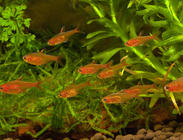 - Forma: Cuerpo pequeño y ligeramente comprimido, con aletas cortas y transparentes. Coloración naranja intenso o ámbar, especialmente visible con buena iluminación y fondo oscuro.
